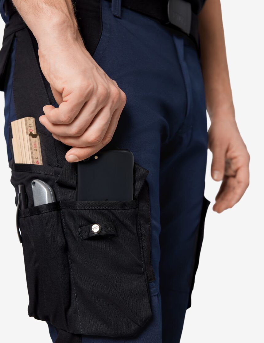 Handy-, Stift- und Zollstocktasche auf beiden Seiten der Hose. So sind die Dinge mit der rechten oder linken Hand immer schnell griffbereit.