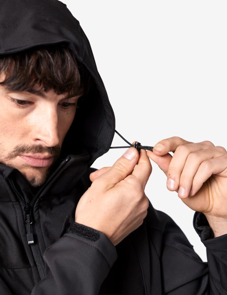Die Kapuze ist per Kordelzug (mit Kordelstopper) verstellbar und kann an das Gesichtsfeld angepasst werden. Sie schließt zusammen mit dem hoch gearbeiteten Kragen den Kopf bei ungemütlichem Wetter gut ab.