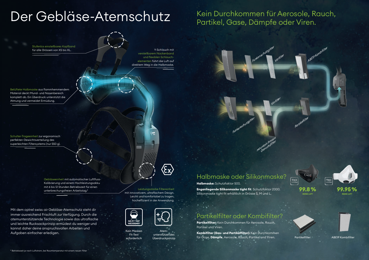 Durch dieses Konzept erübrigen sich aufwändige Fit-Tests, welche bei herkömmlichen Halbmasken üblich sind.
