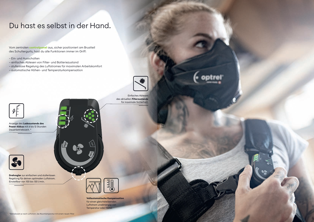 Die saubere Luft kommt über einen Y-Schlauch von einem miniaturisierten Gebläsesystem, welches bequem von einer Trageeinheit auf dem Rücken getragen wird.